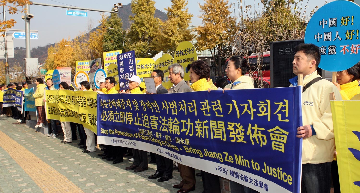 【明慧网二零一零年十一月十三日】二十国集团(G20)首尔峰会于韩国当地时间二零一零年十一月十一日召开,韩国法轮大法学会于当日上午在中共驻韩使馆前举行集会,谴责中共对法轮功的残酷迫害,并呼吁法办迫害元凶江泽民。