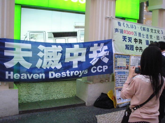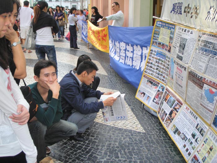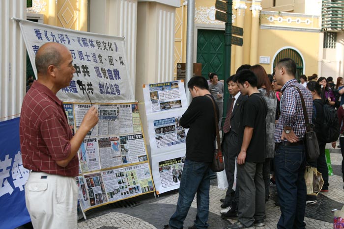 有大陆游客见到学员打出的“法轮大法好”、“天灭中共”及“制止迫害法轮功”大幅横额表示惊讶,随行的友人即表示:“法轮功在香港及泰国的横额还要多。”周日集会将到尾声时,参加完“中葡论坛”的中共代表团成员亦纷纷到玫瑰堂前地游览,学员象对待其他游客一样,向他们派发《九评共产党》书籍及其他资料。看着他们想看却不敢看,一面看着同伴,一面斜视偷偷看大法真相横幅的样子,真实感受到在中共邪党统治下,中国人的悲哀和无奈,同时更令法轮功学员们坚定了要让所有中国人了解真相,帮助他们退出中共邪党组织的决心。