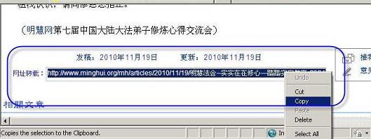 1、在明慧文章的底部有一个“网址转载”的文本框,框内是当前文章的网址。把鼠标移到这个文本框,网址就会被选择,用鼠标右键点中文本框,选择“复制”(copy)就可以拷贝到本文的网址了。