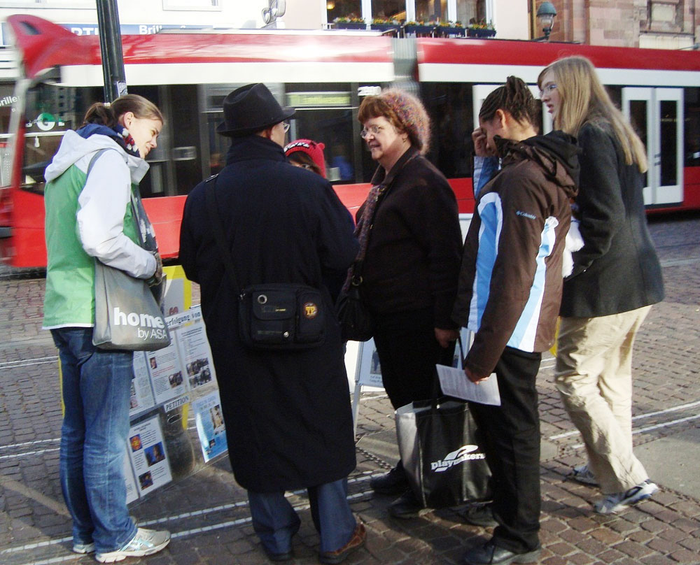 一位刚刚从国内出来的华人女士和她的德国先生路过信息台,学员问她是否知道三退的事?她说:“知道,在国内就知道退党的事,我们那的人都知道,但是我没入过党、团、队,只是在幼儿园时好象戴过绿领巾。”学员问她的父母是否戴过红领巾,她说:“他们都在农村,没上过学,好象都没戴过。”学员告诉她,如果参加过中共的党团队,千万别忘记声明退出来,并告诉她,请记住“法轮大法好,真善忍好”这九个字,会给你带来福运吉祥。她感激地一个劲地点头。