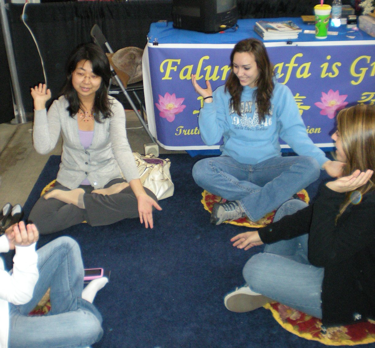 前两天白天是学生专场,介绍法轮功的展位尤为吸引人。尽管学员有两个展位来教功,但还是显得拥挤。来学功的人常常需要排队。一位学员教功,另一位学员就对围观的人进行讲解。教功前先简单介绍什么是法轮功(又称法轮大法),其在世界上的洪传及在中国无辜遭受的迫害。然后学员教功,结束后再送给人们小传单,希望他们把“真、善、忍”三个字记在心中。无论来时什么样,随着听讲解,人们的表情都会变得安静祥和起来。