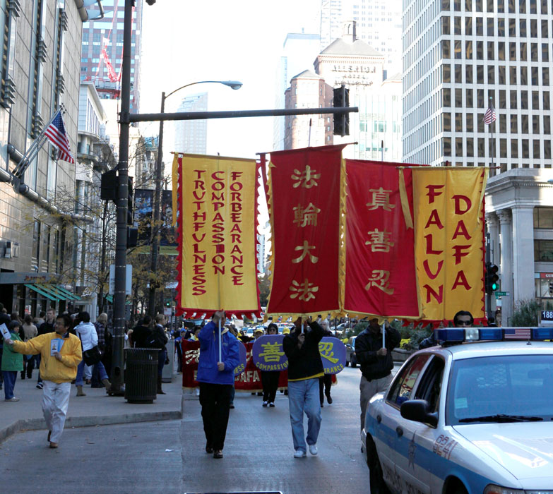 法会的前一天,十一月六日,法轮功学员们在芝加哥市中心举行了大型集体炼功和游行。集体炼功后,游行从水塔(Water Tower)开始,途径最繁华的密歇根大道,最后到达中领馆前。沿途吸引了无数路人驻足观看与拍照。人们认真地阅读横幅上传达的揭露中共迫害的信息,还有路人鼓掌表示对法轮功的支持。学员们在中领馆前再度举行集体炼功,并抗议中共对法轮功长达十一年的残酷迫害。