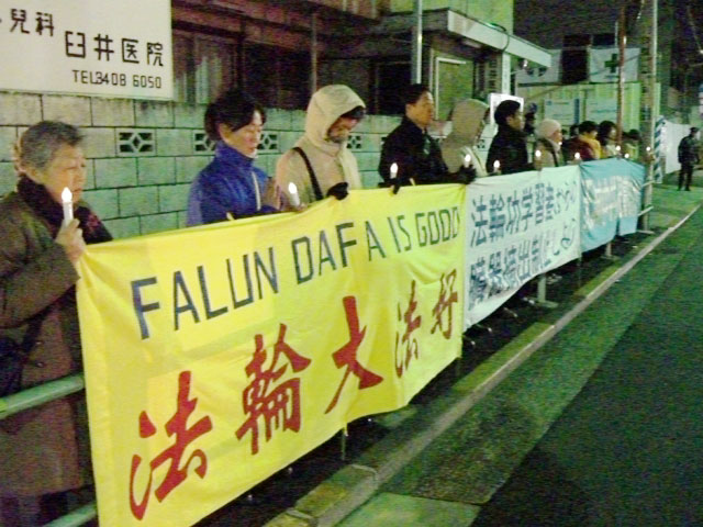 ![]() 二零零六年十二月三十一日,日本法轮功学员在中使馆前烛光悼念在中国遭迫害致死的同修 |