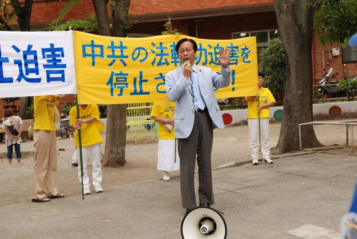 中共迫害法轮功至二零零九年已经十年,日本法轮功学员从二零零九年七月十七日至二十日,举行了系列反迫害活动,包括在日本国会讲真相、开记者招待会、在中共驻日使馆前和平抗议、烛光悼念,集会游行等,向日本社会传达真相,呼吁尽快结束中共对法轮功长达十年的迫害。二十日,法轮功学员在东京举行集会和游行,东京都议员土屋敬之、人权活动家安东干、在日华人等到场声援。