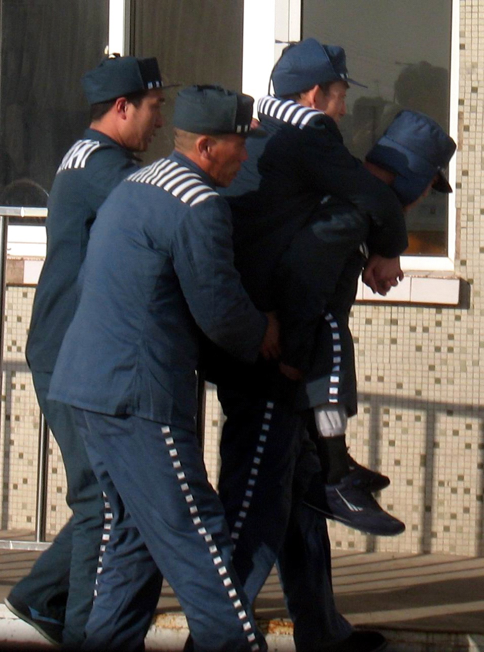 绝食两年不能自己走路的刘永旺(2008照,左图被背着的人是刘永旺)