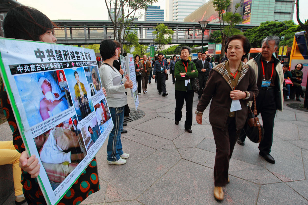 ![]() 大陆游客在台北信义广场前一零一大楼前观看法轮功学员举的真相看板 |