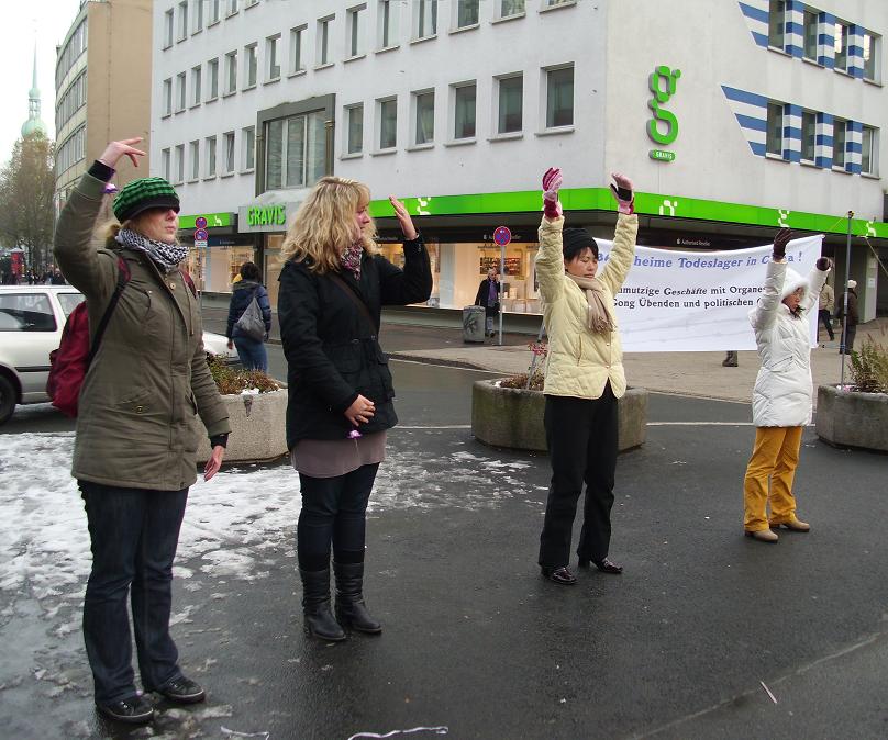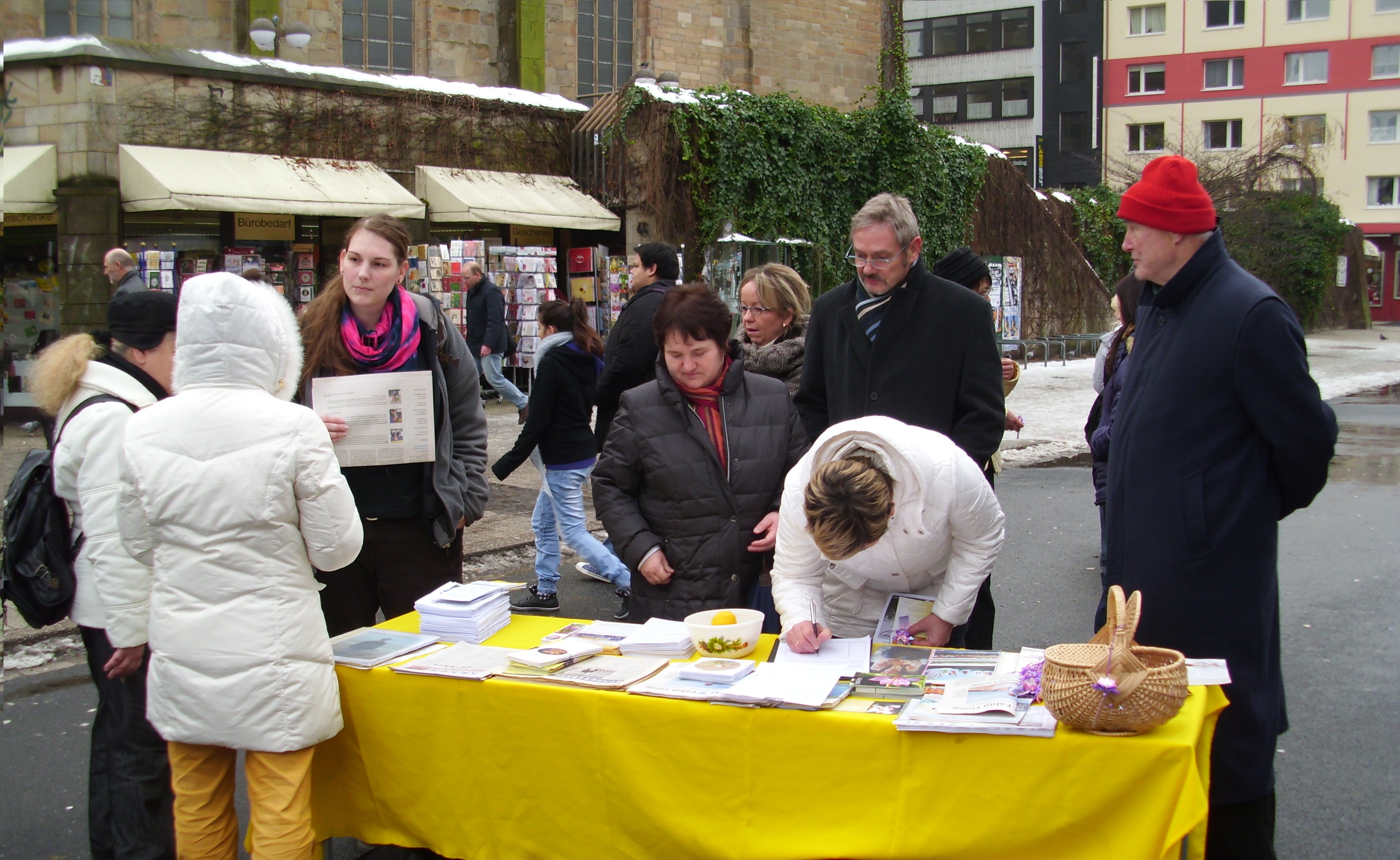 十二月十日这一天,人们在经过市中心繁华街道的时候,都会看到法轮功学员摆设的信息台,信息台的桌子前面用德文写着:十二月十日,世界人权日。在信息台的后面有一条德文横幅,上面写着:三十六个中国的死亡集中营,横幅的旁边有一个法轮功真相展板,展板上用德文介绍了法轮功的五套功法,旁边法轮功学员在舒缓的音乐下炼功。当天信息台前经常是站满了反对迫害、支持人权的德国人,人们等待着在制止中共活体摘取法轮功学员器官的签字簿上签名。