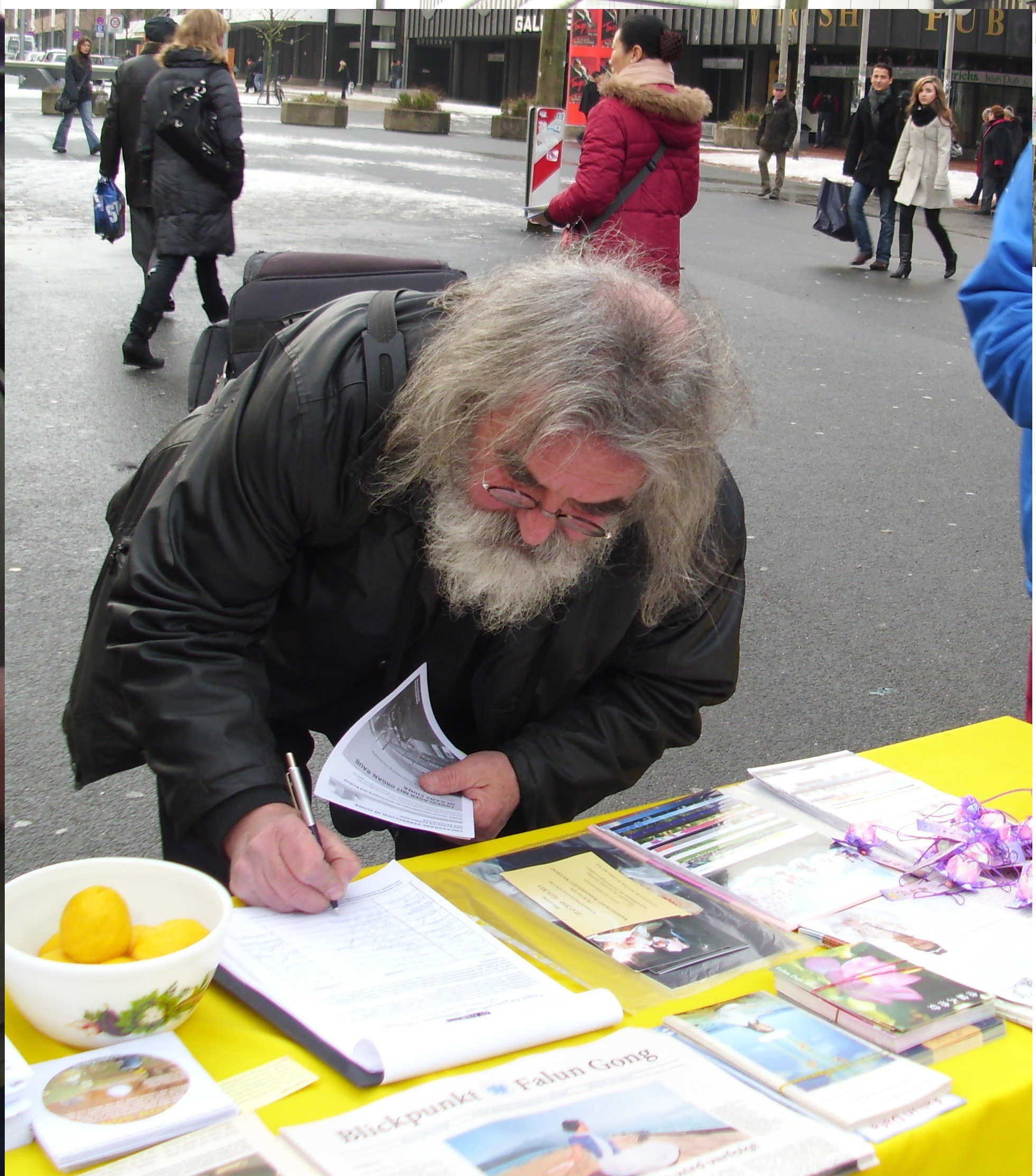 一名德国小伙子,开始对发生在中国的迫害表现的漠不关心,他觉得中国对他来说很遥远。法轮功学员就给他讲水滴石穿的道理,如果更多的德国人站在正义的一方,对中国人是多大的支持啊!中国人本来就深受中共迫害,如果你和周围的中国人讲述这些迫害的事情,那不也是在减轻这场迫害对人的伤害吗?小伙子和法轮功学员聊了很长时间,最后也在签字簿上签名了。