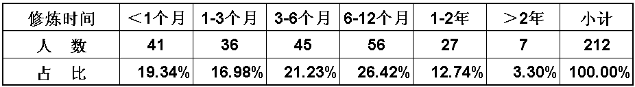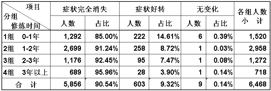 2.5 修炼时间的长短与身体变化的关系比较。表5看出随着修炼时间的延长,疾病症状消失率也随之递增,并呈显著差异(P<0.01)。u检验:第2组比第1组症状消失率升高明显,u:5.25 P0.01;