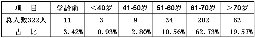 2.6 表6反映人群文盲年龄分布情况,文盲者322人,其中61-70岁202人,占总数62.73%,70岁以上63人,占总数19.56%。