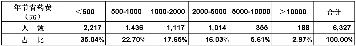 2.8 修炼人群中医疗费的节省数额引人注目。修炼前因患各种疾病绝大多数人有不同程度的医疗费开支,少则500元/年,多则上万元/年,修炼后身体的显著改变,再也不需要进医院了。6327人参加了医疗费开支节省的调查,每年节省医疗费共1524.07万元,人均2408.84元。分布情况见表8。