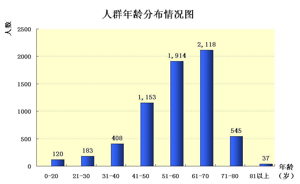 2.1 表1,可见6478人年龄分布在各个年龄组,以51—70岁两组中最集中,共4032人,占被调查人数62.1%。