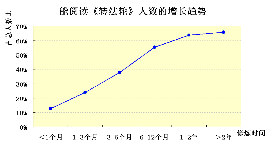 2.7 表7反映文盲修炼后阅读能力显著提高。322人中已有212人能阅读《转法轮》一书。这212人中修炼前完全不识字124人,识少部份字无读书能力者46人,识一些字但阅读比较困难者70人。在表7中可看出,1年内能阅读《转法轮》者178人,占总阅读人数的83.96%。