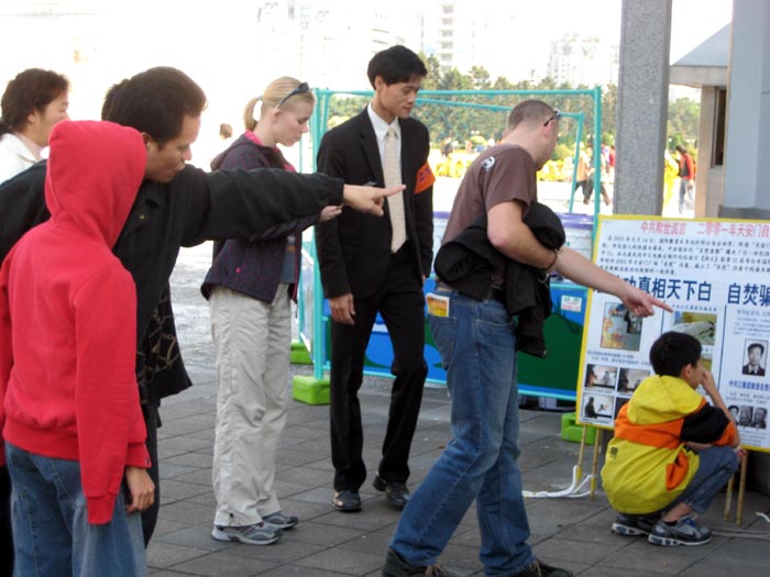一位身材高挑的帅气小伙子对法轮功学员说:“我看退党的人数恐怕远远超过这数(指八千五百万人数),有些人退了也不敢随便让人知道。”他看着广场上近百位学员集体炼功,以及其他忙着准备场地的学员,感叹说:“在我们那边看不到这样的场面,在台湾的人真是好,很幸福。”