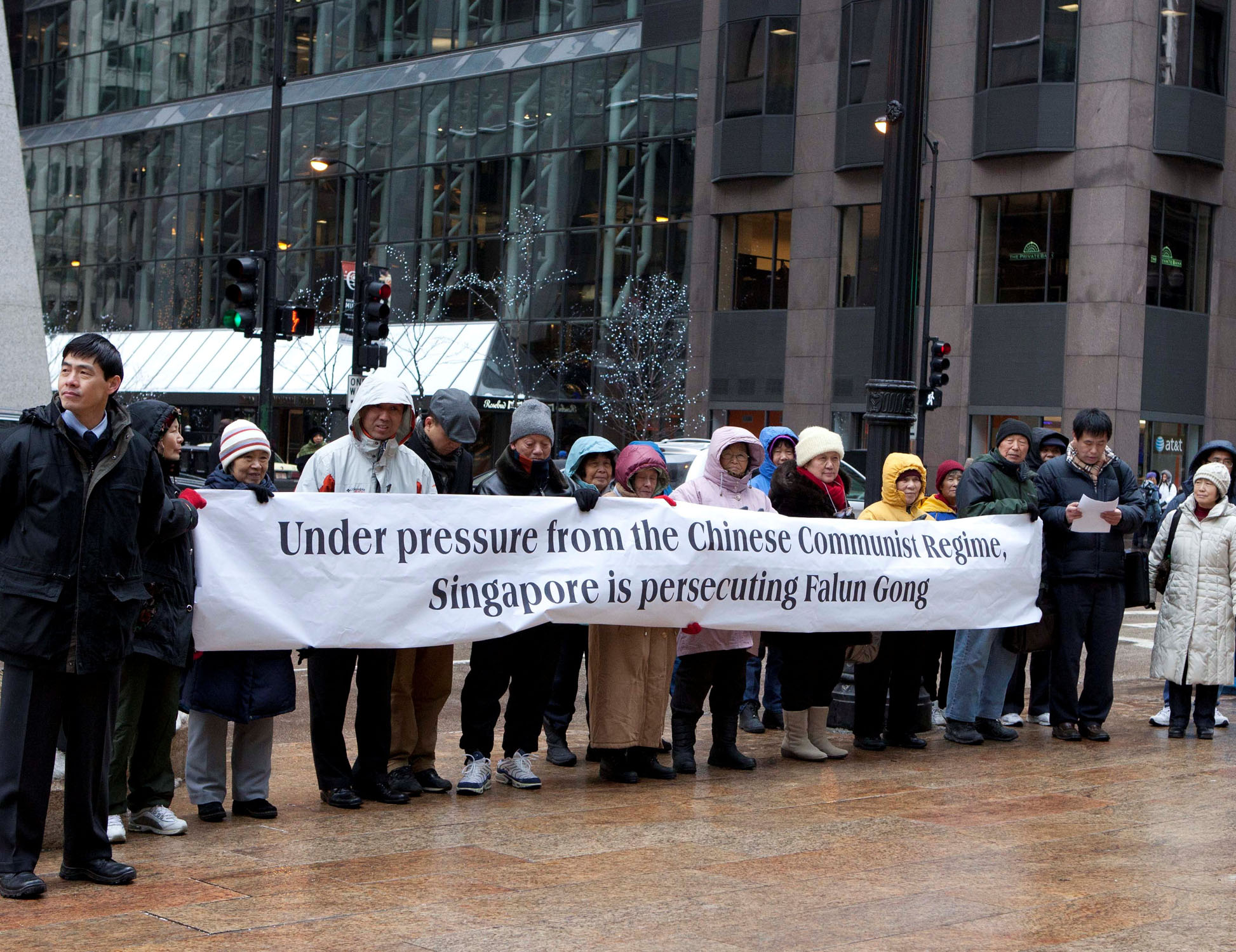 【明慧网二零一零年十二月二十三日】自一九九九年以来,中共不但在中国大陆迫害法轮功学员,还利用其经济、外交压力将迫害延伸到海外。在此情形下,许多在新加坡的中国大陆籍法轮功学员在更新各种准证、申请永久居民和新加坡公民时都遇到极大的困难,许多人被迫离开新加坡去往第三国。自二零零六年开始,新加坡政府甚至取消中国大陆籍法轮功学员尚未到期的合法居留准证,强行遣返。仅在二零一零年,已有两名中国大陆籍法轮功学员因为有效居留准证被取消,而被迫离境。近日新加坡政府又欲将一名居住在新加坡的中国大陆籍陪读妈妈崔二芹遣返大陆,此举引起世界各地法轮功学员的关注。二零一零年十二月二十二日,美国中部的法轮功团体在位于芝加哥市中心的新加坡领事馆前,抗议新加坡政府针对法轮功学员的作为。