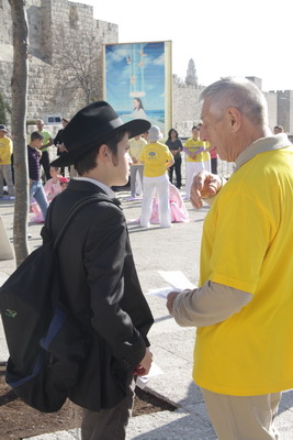 十二月二十四日,天高气爽,法轮功学员在耶路撒冷古城(Jerusalem-Saar)举行了活动。耶路撒冷古城是世界旅游胜地,尤其圣诞节期间,来自世界各地的游客更是数不胜数。人们被这番格外的风景所吸引,纷纷驻足聆听这优美的音乐、观看由法轮功学员自编自演的中国传统舞蹈、至简至易的五套功法的演示、以及法轮功学员用英语及希伯来语交替介绍法轮功的由来,世界一百多个国家的人们受益于法轮功,以及目前在中国大陆受到迫害、法轮功学员在中国遭受的惨不忍睹的酷刑甚至被活摘器官的黑幕。