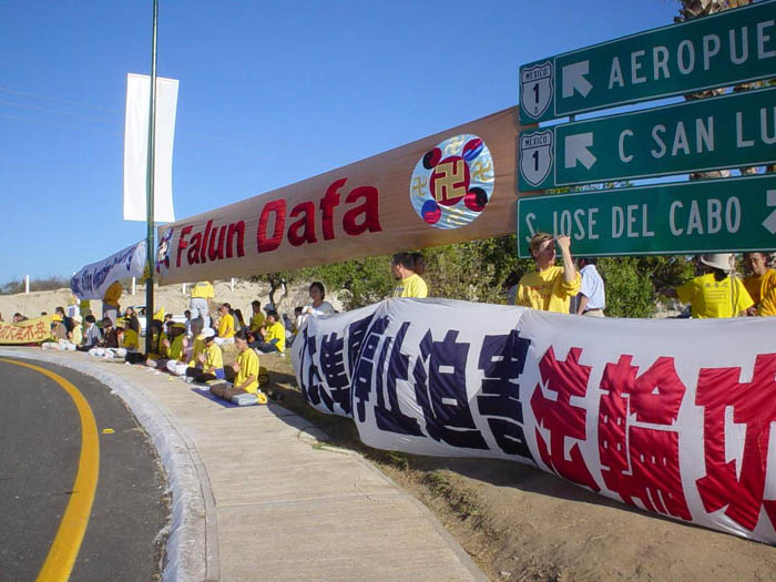 二零零五年九月十一日至十三日在胡锦涛访问墨西哥期间,中共官员千方百计想遮挡法轮功学员的横幅,企图阻挡胡视线。法轮功学员却成功令胡锦涛及随行人员近距离看到抗议横幅。