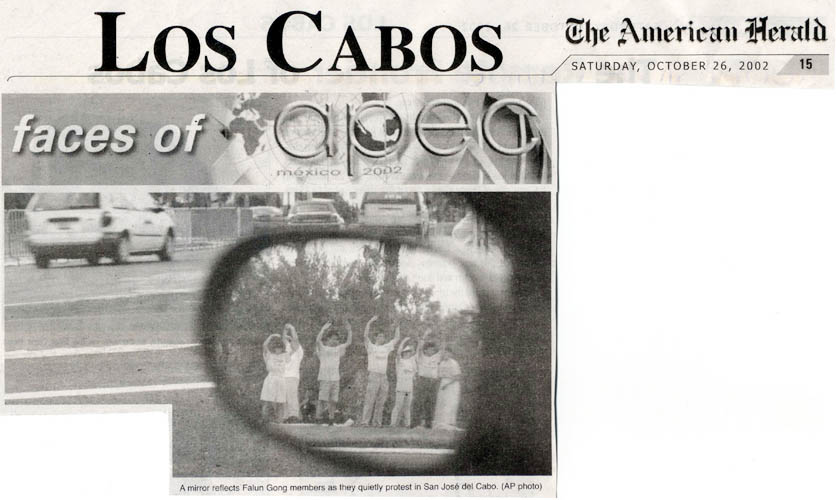 二零零二年十月二十六至二十七日,APEC(亚太经合会)在墨西哥洛斯卡沃斯(Los Cabos)召开,法轮功学员在首都墨西哥城中领馆前发正念,和平抗议江泽民在中国对法轮功的血腥迫害。当地《墨西哥新闻报》与BBC(英国广播公司)、路透社、法国国际广播电台等国际媒体都以显著篇幅报导。