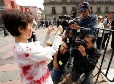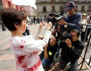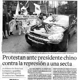 路透社二零零五年九月十二日报导,墨西哥法轮功学员在中共党魁胡锦涛抵达墨西哥城前,在参议院大楼前举办揭露中共迫害的酷刑展。