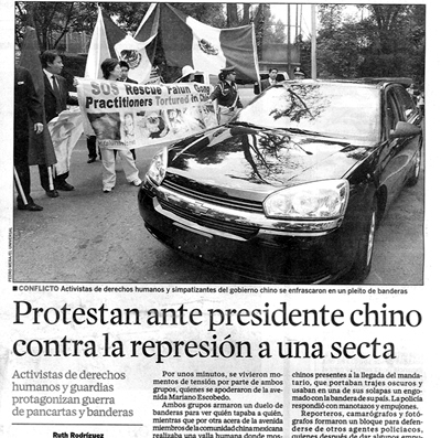 主导这场残酷迫害的罪魁元凶江泽民,二零零二年十月曾到访墨西哥,此事也让迫害真相更广为墨国民众所知。二零零二年十月二十三日,墨西哥国会议员阿古思达•萨拉泽(AcostaSalazar)在墨西哥国会举行新闻发布会,声援法轮功学员反迫害。三家电视台,三家广播电台和许多新闻社参加了此次发布会。