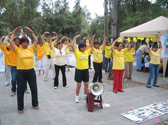 二零零七年五月十三日,墨西哥城的法轮功学员在查普特佩克公园(Chapultepec Park)北部的国立人类学博物馆附近集体炼功,民众被祥和宁静的场面吸引,想进一步了解法轮功真相。