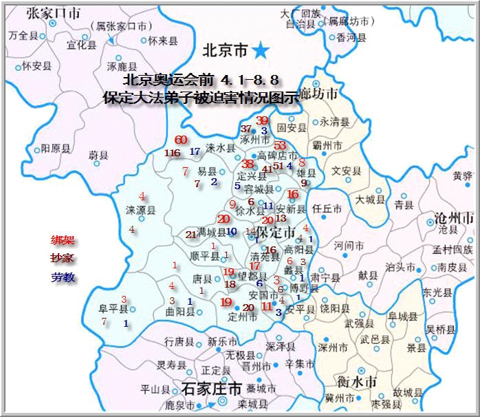 据不完全统计,二零零八年四月一日至八月八日,即北京奥运开幕前期,仅四个月的时间,保定地区就有3人被迫害致死,362人被绑架,25人绑架未遂,402人次被非法抄家,80人被严重骚扰,67人被非法劳教,有10人被非法开庭。奥运之年,保定“六一零”更是践踏人权,罪恶昭彰。