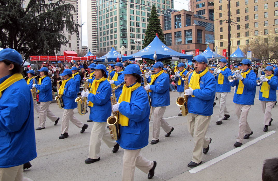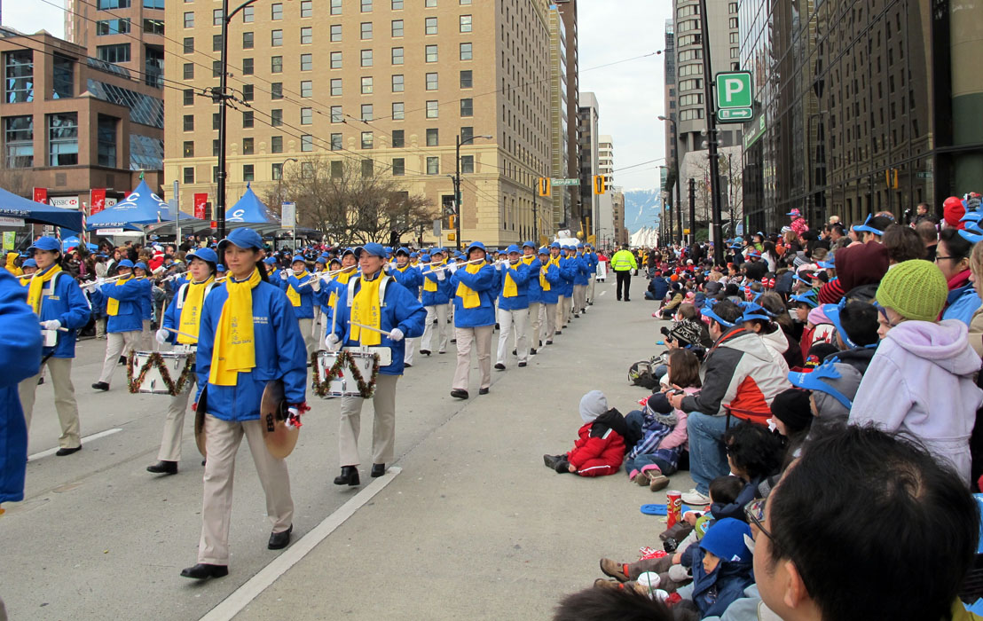 游行当天,温哥华天气较冷,虽然游行出发前有长达几个小时的等待,但是游行一开始,天国乐团的成员们都精神抖擞,特别是看到这么多的观众,使他们能听到法轮大法的福音,大家都感到很高兴。