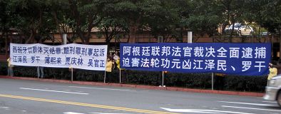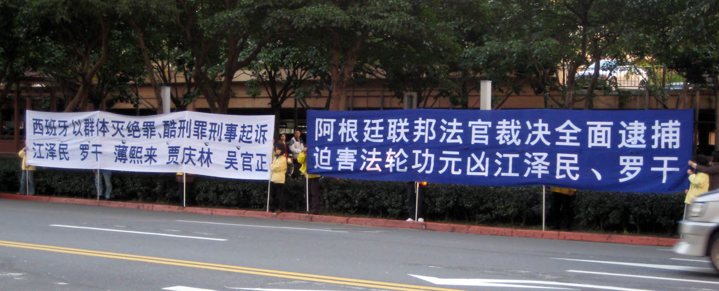 某日下午四点多,几位大陆观光客站在楼前人行道公车站牌下,等待游览车接送他们到下一个景点的空档,看着对面法轮功学员举着阿根廷及西班牙起诉中共迫害元凶的横幅。一位年约五十多岁的先生回答同伴说:「他们(指江泽民等元凶)是迫害法轮功的首恶,所以才会被起诉和缉捕。」一位说:「原来法轮功特好看的,不过是炼功嘛,我看着挺好,干啥要阻止呢。」