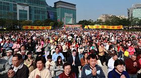 【明慧网二零一零年二月十四日】(明慧记者郑语焉台湾台北报导)二零一零年一月三十日,是近一个多月以来难得的周日好天气,初春晴朗的阳光好似今日一千多位台北法轮功学员的心情,亮丽又温暖。这些学员携家带眷,在二零一零新的一年将临之际,相继来在台北一零一大楼对面的信义广场,脸上洋溢着幸福喜悦与感恩的虔诚,双手合十齐颂:“恭祝师尊新年好!”声音响彻云霄。