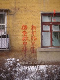 在城乡道路两边的电线杆上、围墙上、家属楼的墙上、大树上、集市上等出现喷漆和真相条幅标语——真相标语有:“天灭中共恶党”、“退党保命”、“声援六千八百万人退党保命”、“平反法轮功,法办江泽民”、“信仰无罪,停止迫害”、“佛光普照、礼义圆明”、“新年新气象,退党救中华”等。