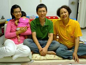 修炼后的江连泉(中)象个温文儒雅的大男孩,左一是玉伦与女儿,右边是岳母。