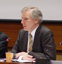 ![]() 特派专员菲利普-奥尔斯顿先生(Mr. Philip Alston)在日内瓦联合国会议期间聆听证人的发言 |