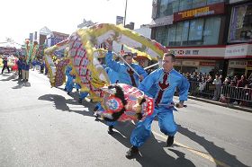 仙女散花,龙吟虎啸,还有传统的七彩大灯笼,上书金色的“法轮大法”,“真善忍”,法轮功学员手持灯笼,热情地向道路两边的观众挥手致意。