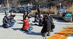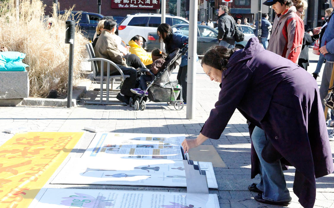 ![]() 法轮功学员在波士顿中国城安详而宁静地炼功,吸引了过往民众的驻足。 |