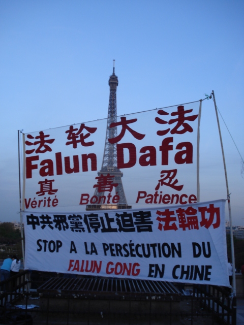 自二零零五年以来,为揭露中共邪恶本质、制止其迫害法轮功,一些法国法轮功学员经由合法申请手续,经常在埃菲尔铁塔附近设立展板,播放录音,散发《九评共产党》,揭露中共迫害百姓的事实,劝说每天众多的中国游客退出中共、共青团和少先队(三退),据粗略估计,至今已有近万中国人在此“三退”。