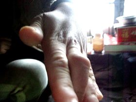 ![]() 2010年图片:柳志梅的左手中指已残疾,骨节粗大,严重弯曲变形,无法伸直 |