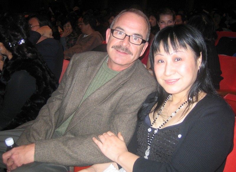 五次“艾美奖”最佳混音奖的得主道格拉斯•戴维先生(左)邀请女友陆女士一同观赏神韵艺术团在洛杉矶的演出