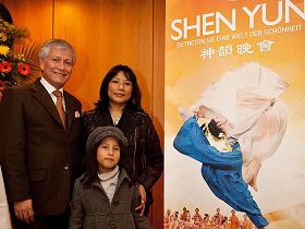 哥伦比亚驻法兰克福领事馆总领事穆尼奥斯(Henry Javier Arcos Munoz)一家三口观看了神韵在法兰克福的首场演出。他赞叹神韵演出:“壮观!”“我从来没看到过这么特别的演出。”他尤为欣赏神韵乐团,“舞台的天幕很特别,颜色与音乐都很棒,还有乐团,我尤其欣赏神韵乐团。”