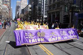 在一百五十个队伍中,有一支法轮功学员组成的队伍,包括法轮功天国乐团、炼功队和花车。这支不同凡响的队伍给人们带来了格外惊喜。当法轮功的队伍演奏着“法轮大法好”的乐曲经过时,旧金山居民艾丽森女士高兴地为法轮功天国乐团的演奏鼓掌。她表示,法轮功的乐团演奏的真是太棒了。当她了解到法轮功的原则是真、善、忍时,她说:“太好了。真是太好了。”