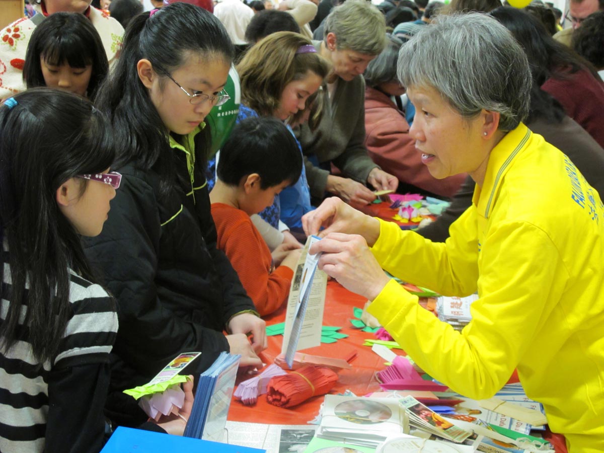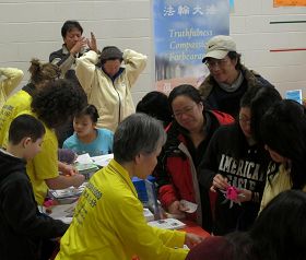法轮功展位前人群络绎不绝,民众被法轮功学员演示功法的祥和美好而吸引。一位华人老先生在学员娓娓道来自己炼功后身心的变化,和共产党以欺世谎言迫害法轮功后自己的亲身经历以后,向学员询问炼功地点。一位梁女士来到展位前急切地询问教功录像带,希望早日开始修炼法轮功。