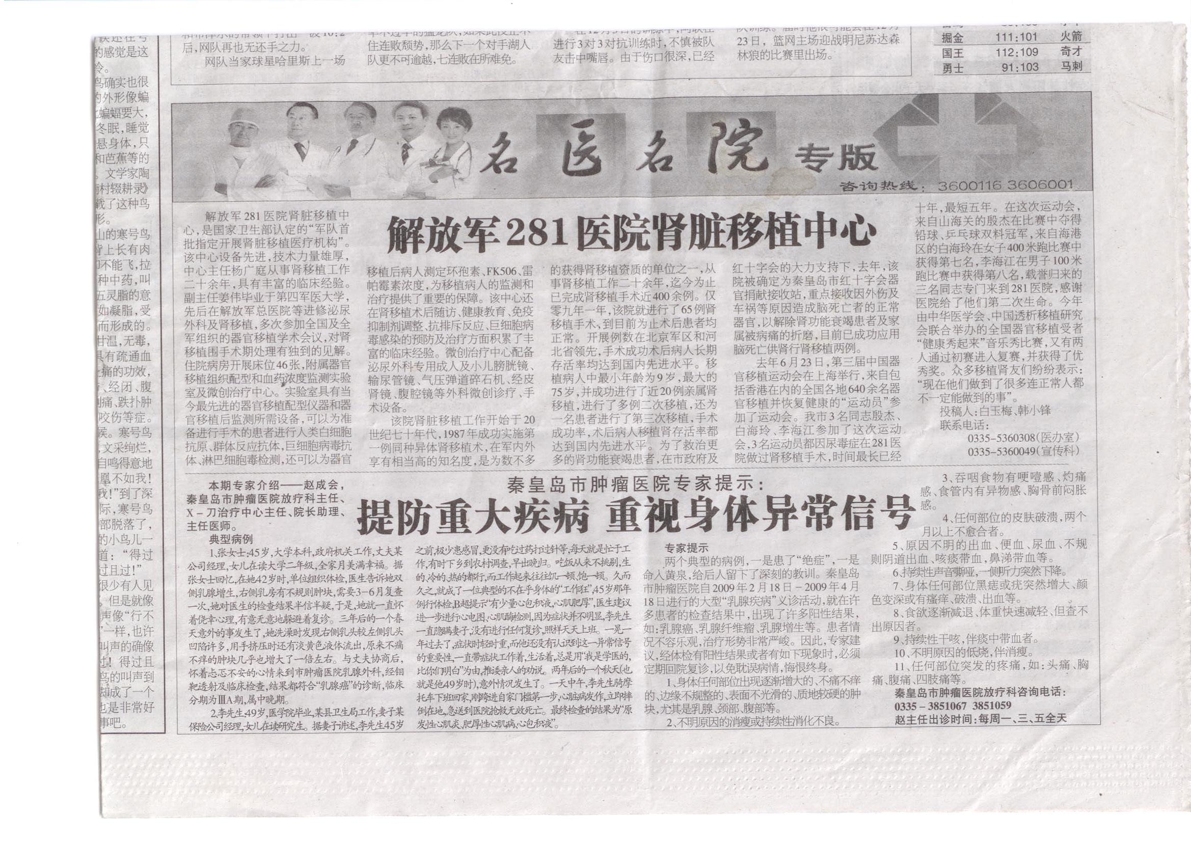 曝光秦皇岛晚报(2009年12月18日星期五)11-B版 刊登的“解放军281医院肾脏移植中心”这篇报道中说:从1987年到今天已经做400例肾移植手术;仅2009年该院就进行了65例肾移植手术(大约每周1.3例,可见其供体来源可疑)下面把(2009年12月18日星期五)《秦皇岛晚报》扫描片(一版分两次扫描)一同传去,作为参考据。