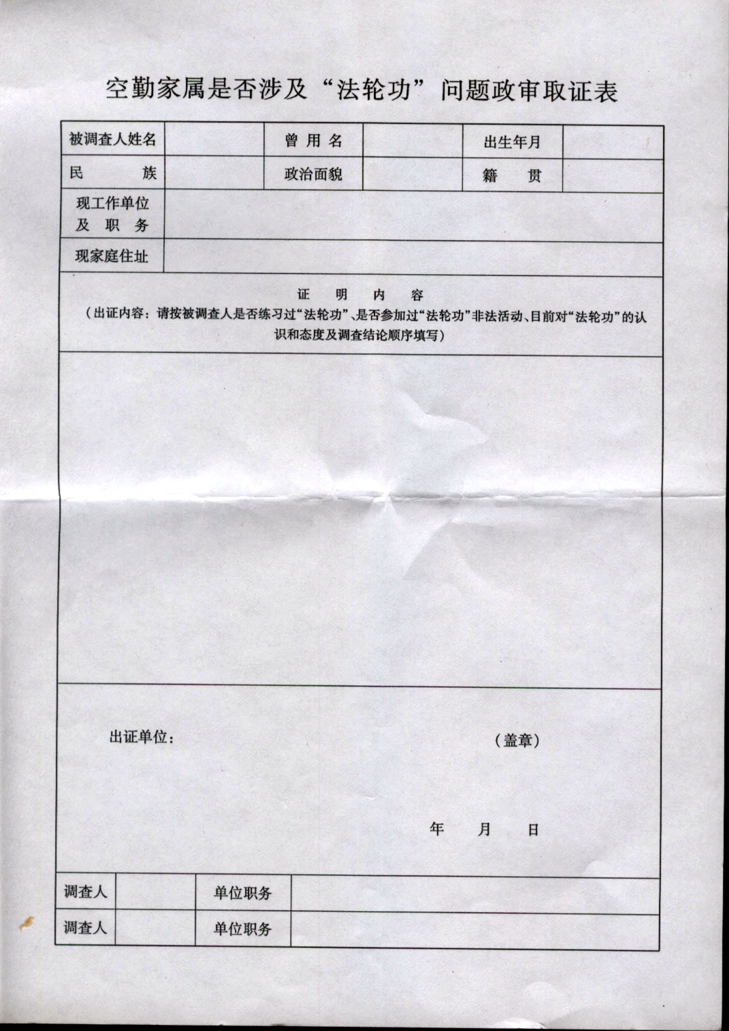 被调查人是否炼过法轮功;是否参加过法轮功的活动(被调查表诽谤为所谓的“非法活动”);目前对法轮功的认识和态度。要求出证单位的公章和两个调查人签名。年底部队还要派人来空勤家属的单位当面调查空勤家属的思想政治表现。