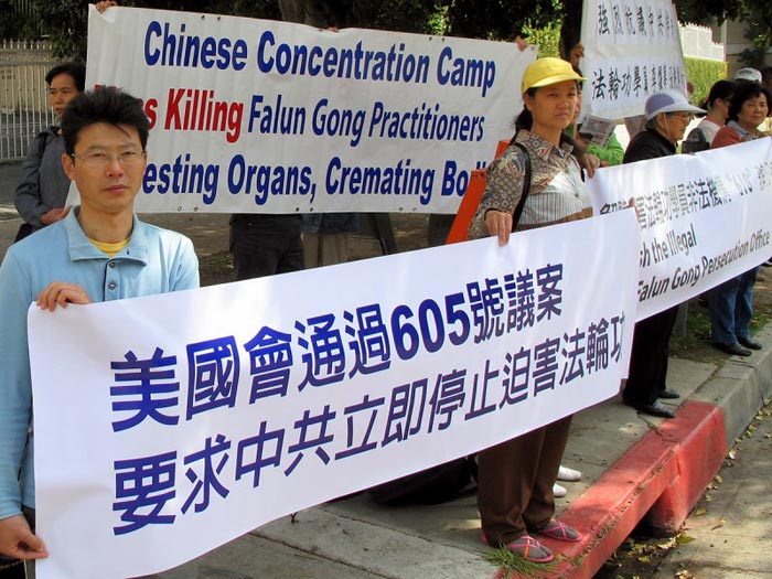 【明慧网二零一零年三月二十七日】美国国会以压倒多数通过要求中共立即停止迫害法轮功的605号决议、谷歌宣布停止对“谷歌中国”搜索服务的“过滤审查”,并将搜索服务由中国内地转至香港,这一系列事件令美国民众的目光再次聚焦中国人权。二零一零年三月二十五日,洛杉矶法轮功学员在中领馆前举办集会,抗议中共持续迫害法轮功,并呼吁国际社会关注他们因修炼法轮功而在中国被非法关押的亲属。