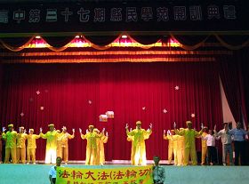高雄县路竹高中于二零一零年三月二十六日庆祝创校五十五周年校庆运动大会,大会由苏校长主持,教职员二百多位与学生二千多人,并敬邀多位学术界及政治界首长参与,法轮功学员组成的腰鼓队首次受邀。