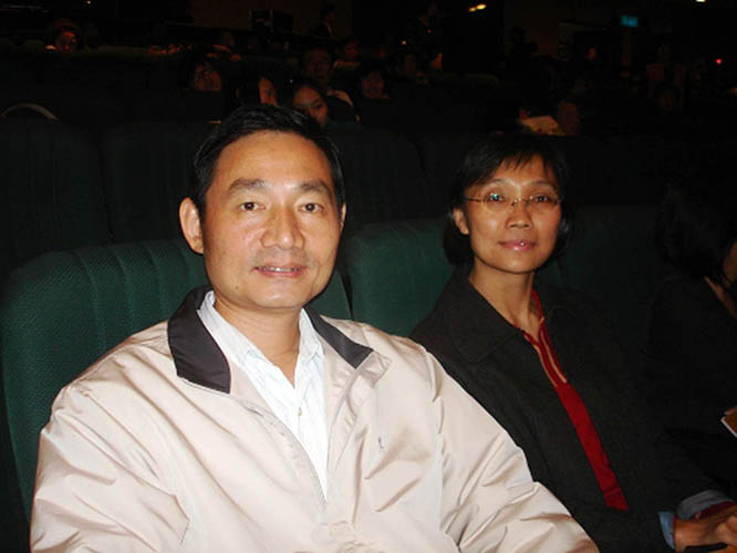 吴凤技术学院教授廖俊杰(右一)偕同夫人及小孩,一家人于二十八日晚上在民雄表演艺术中心观赏神韵演出
