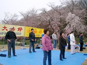 有一位住在名古屋的女士,跟着公公婆婆来到了樱花节,她婆婆家就在附近住。她在学了法轮功的第一套功法后表示感觉很好,浑身感到热呼呼的,表示今后要学炼法轮功。她说以前在网上曾看到过法轮功在中国受迫害的内容,问学员:“在日本炼法轮功,没关系吗?”当学员对她说:“在日本炼法轮功,没有关系,都是自由的。当法轮功学员有游行的活动时,日本的警察都会为我们维持秩序,保护我们的,而且还有警车开道。”她听后笑着说:“那还不错!”