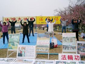 丰田市现有四十二万人口,外国人一万五千多,其中中国人大约有三千人左右。在这两天的时间里,就碰到了很多来观赏樱花的中国人。有的年轻的中国人一看到草坪上打出的“法轮大法好”和“法轮功免费学功有益身心健康”的横幅,马上拿出相机拍照。法轮功学员们趁机把真相资料送给他们,并告诉他们法轮功现在已弘传世界一百一十四个国家和地区,为什么法轮功在中国大陆受到迫害的真相,以及现在的“三退大潮”(退党、退团、退队),明白真相后,年轻人当场就有用化名退出少先队。