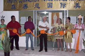 文章说,加拉班(Garapan)的凤凰艺术画廊展出了国际艺术家们的美术精品,作者是令人尊敬的法轮功学员。他们的作品描述了中共对法轮功的迫害,同时传递了“真、善、忍”的信息。作品还表达了人们在面对肆意拘留、酷刑折磨和死亡威胁时仍心存希望。