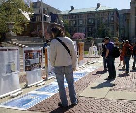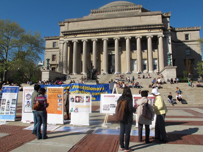 【明慧网二零一零年四月十六日】(明慧记者采菊纽约报道)四月的纽约花红柳绿,位于曼哈顿上城的“常春藤”名校哥伦比亚大学(简称哥大)内绿草如茵,春花灿烂。校园内学子们川流不息。二零一零年四月十二日至十五日,该校的法轮功俱乐部在校园中心地带举办为期四天的“真相图片展”,介绍法轮功真相。