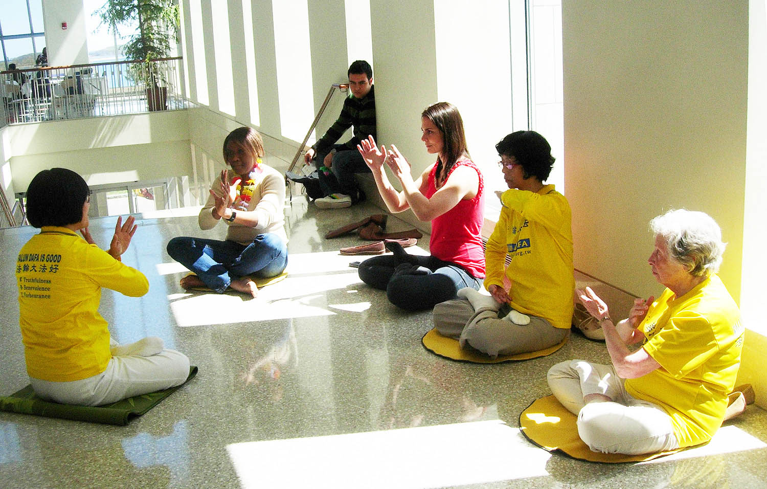 ![]() 麻州州立大学学生观看、学习法轮功第五套法。 |